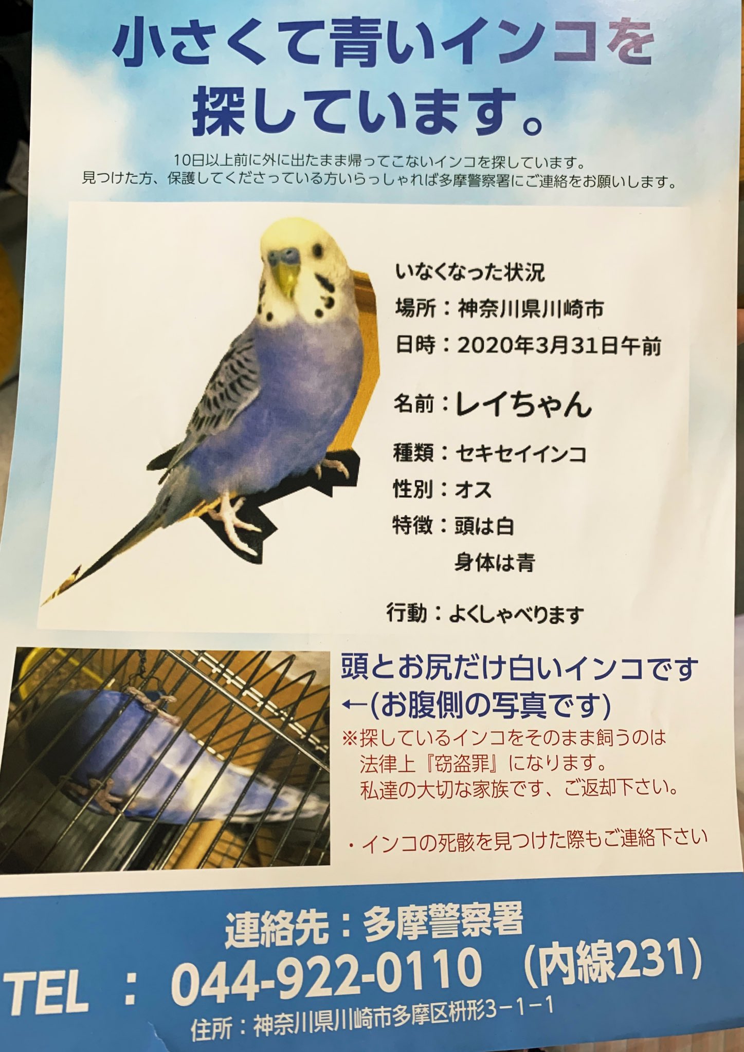 ট ইট র インコのアヤネ𓅛 アヤネ セリーヌ アクキー販売中 Booth 郵便受けに入ってたので載せておきます 神奈川県川崎市で3月31日から迷子になっているそうです お名前はレイちゃん 早く見つかりますように 拡散希望 迷子インコ 迷子 セキセイ