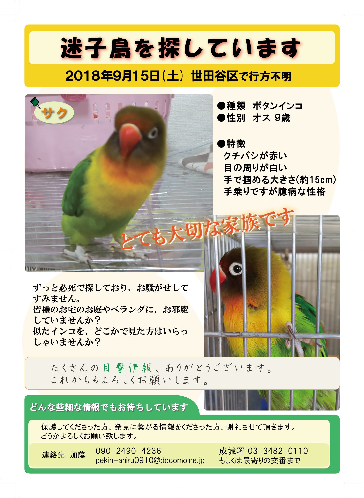 みほ En Twitter お昼頃 成城2丁目の成城二郵便局付近で スズメやセキセイインコよりちょっと大きく 手で掴めるほどのオレンジが入った インコ の目撃情報を頂きました 色々な可能性がありますので 成城近辺の方 見かけられましたら どうかご連絡をお願い