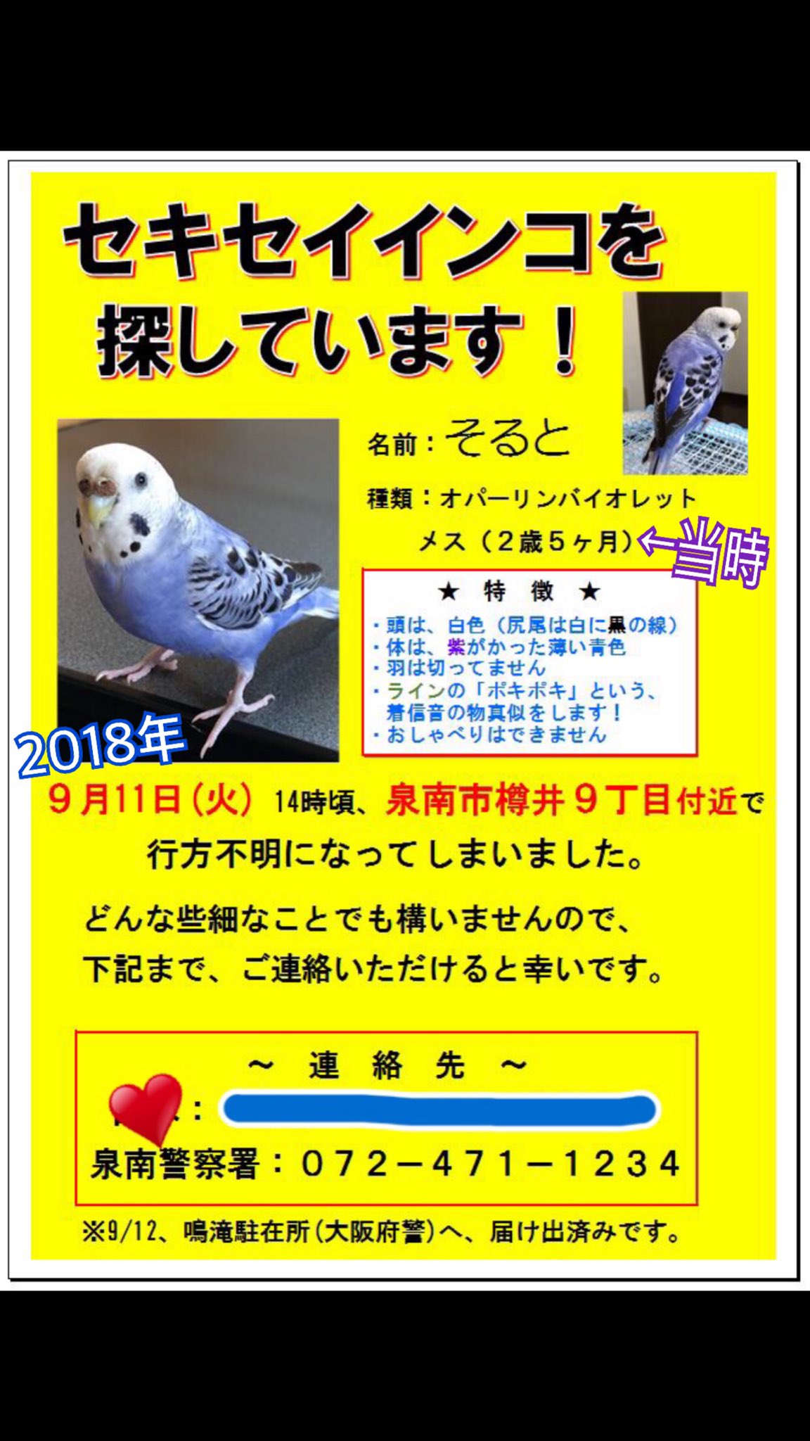 セキセイインコのそると 捜索中 On Twitter 拡散希望 2018 9 11の14時頃 大阪府泉南市の実家から逃した可能性があります 7ヶ月 も経ってしまいましたが どんな些細な情報でもかまいませんので よろしくお願いします 拡散希望 Rt感謝 迷子鳥