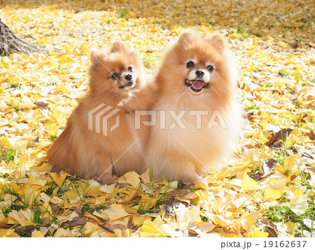 イチョウの落ち葉と二匹のポメラニアンの写真素材 19162637 Pixta