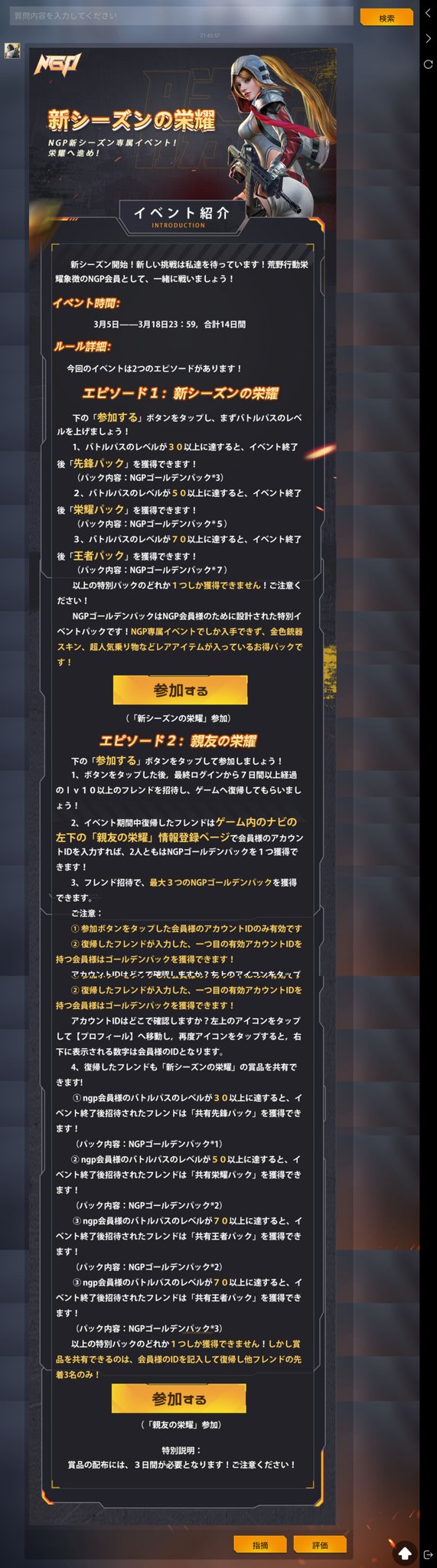 ソルトマト On Twitter 荒野行動ngpゴールデンパック等のイベント参加方法 ーーーーーーーーーーーーーーーーー 1 届いたngp専属のメールのリンクを 押す又はナビを押す 2 メンバー専属のメンバー専属を押す 3 イベントを押す 4 参加を押す 5 完了